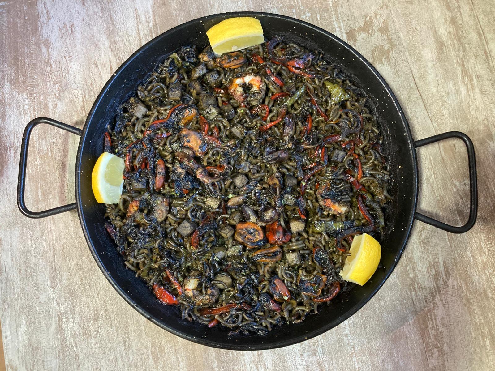Rich, savory fideuá cooked with squid ink, squid, cuttlefish, shrimp, and mussels.