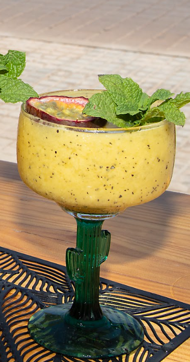 Exotic, tangy, and tropical to the core — our Passion Fruit Daiquiri blends sweet-tart passion fruit with white rum, lime juice, and crushed ice for a smooth frozen cocktail full of island flavor. Topped with fresh mint and half a passion fruit for that tropical wow factor.